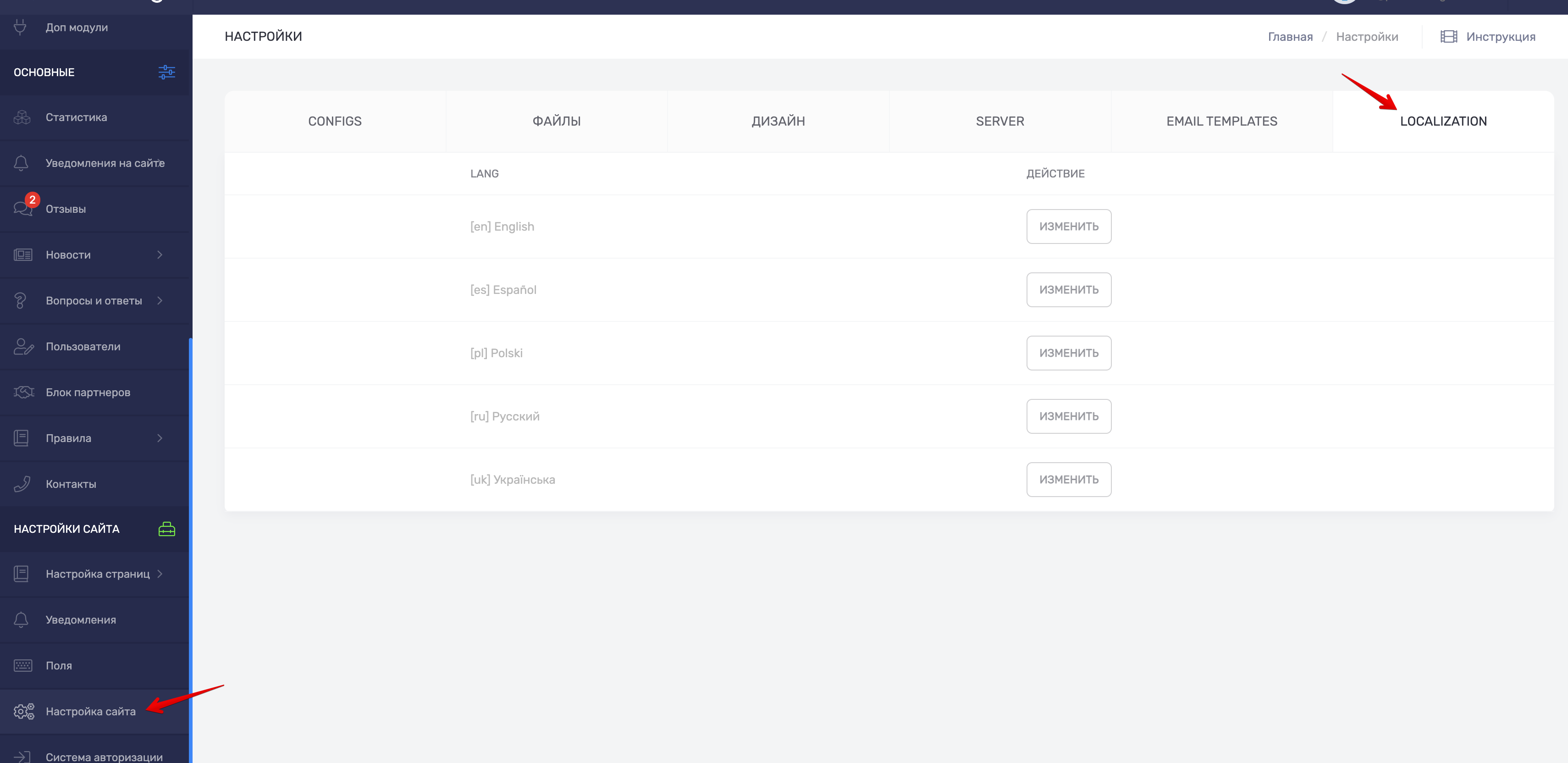 Для того чтобы изменить текст переменной, нажмите "[**Изменить**](#user-content-fn-1)[^1]" напротив необходимого языка -> на странице настроек переменных данного языка, изменить нужную переменную -> нажмите "[**Сохранить**](#user-content-fn-2)[^2]" напротив переменной.&#x20;