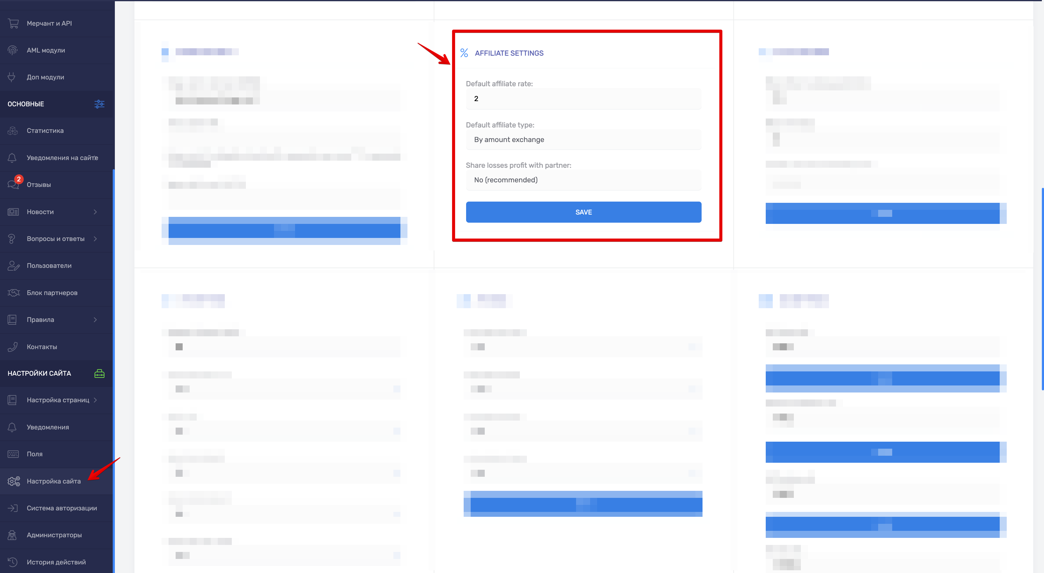 В блоке "AFFILIATE SETTINGS" возможно выставить процент и тип ставки партнерского отчисления, который будет устанавливаться по умолчанию для новых пользователей.&#x20;